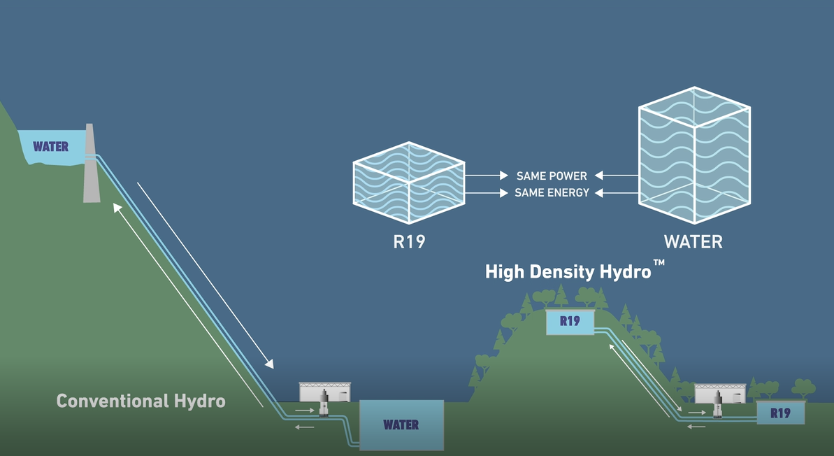 RheEnergise’s High-Density Hydro ™ solution uses the company’s proprietary HD Fluid R-19 ™, which has 2.5x the density of water. This gives RheEnergise pumped energy storage projects 2.5x the power and 2.5x the energy when compared to water, enabling them to be both significantly smaller and located on 60% lower hills, minimising cost, environmental impact and providing 3-4 times greater availability of sites for construction. In addition because projects are much smaller, High-Density Hydro can use buried tanks rather than huge open reservoirs.